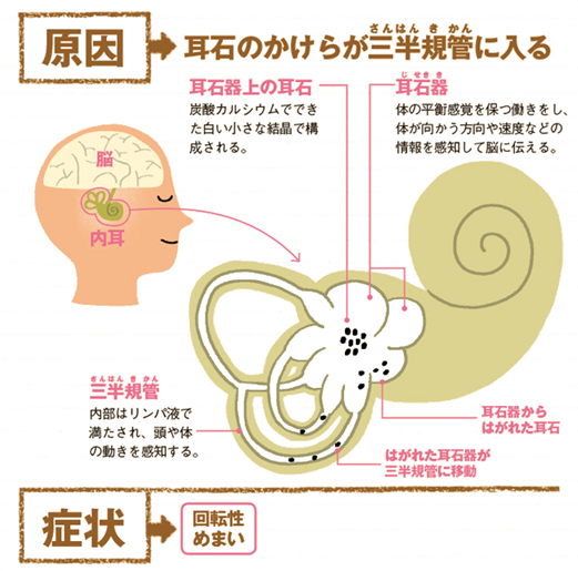 頭を動かしたりしたときに、突然起こる回転性めまいです。数分間で治まりますが、自分や周囲がぐるぐるまわるので、気持ちが悪くなったり、恐怖をおぼえることもあります。