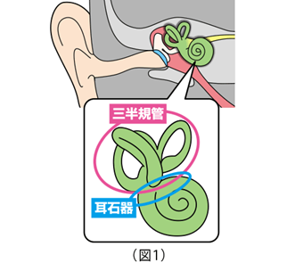 耳には音を聴くといった働きのほかに、体のバランスを保つといった働きがあります。耳の鼓膜より奥には、内耳といった構造物があります。内耳には、リンパ液で満たされた三半規管と耳石器があり、頭の動きによりリンパ液に流れが起き、それが脳に伝わってからだのバランスを保つようにできています。
